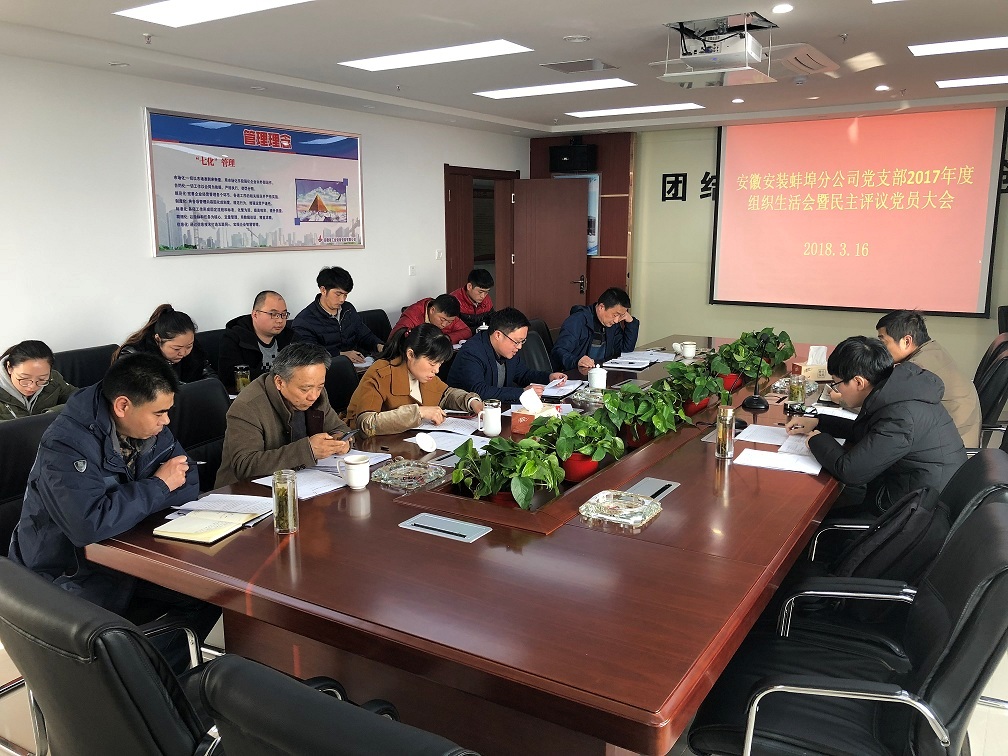 3月16日下午,蚌埠分公司黨支部召開了2017年度專題組織生活會暨民主評議黨員大會,會議由分公司黨支部書記洪軍主持。公司副總經(jīng)理劉安俊、公司黨委辦公室楊俊輝以及分公司全體黨員參加會議。