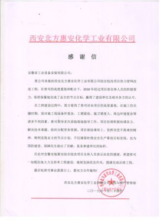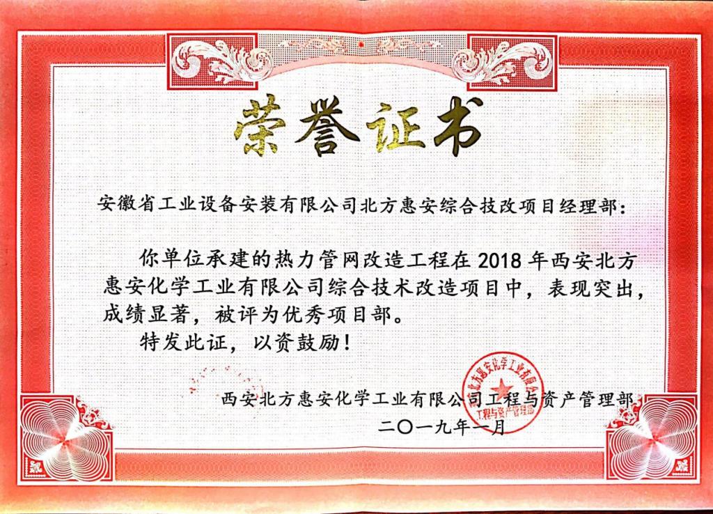近日,安徽安裝承建的西安北方惠安化學工業有限公司綜合技改項目熱力管網改造工程,經項目部全體人員共同努力,保質保量地完成了業主的節點目標,贏得了業主高度認可和好評,被業主授予“優秀項目部”榮譽稱號,成為各參建單位的標桿,業主特別頒發了榮譽證書和感謝信感謝項目全體人員所作出的貢獻,