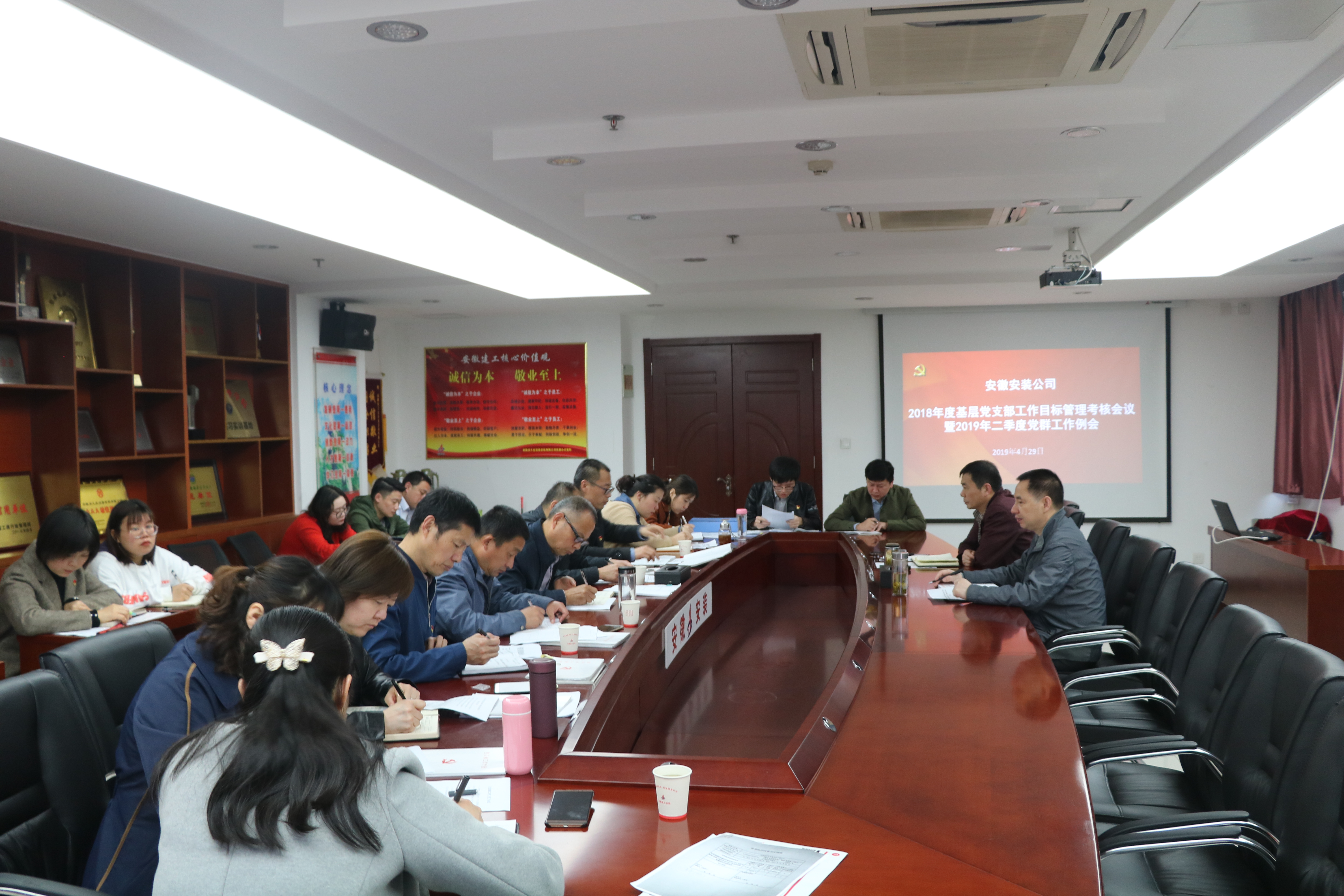 4月29日上午,安徽安裝公司召開2019年二季度黨群例會。會議由公司紀委書記、工會主席李寬旭主持,公司黨委書記、董事長胡六中出席會議,所屬各基層黨支部書記、工會主席、團支部書記及公司黨群部門人員參加了會議。