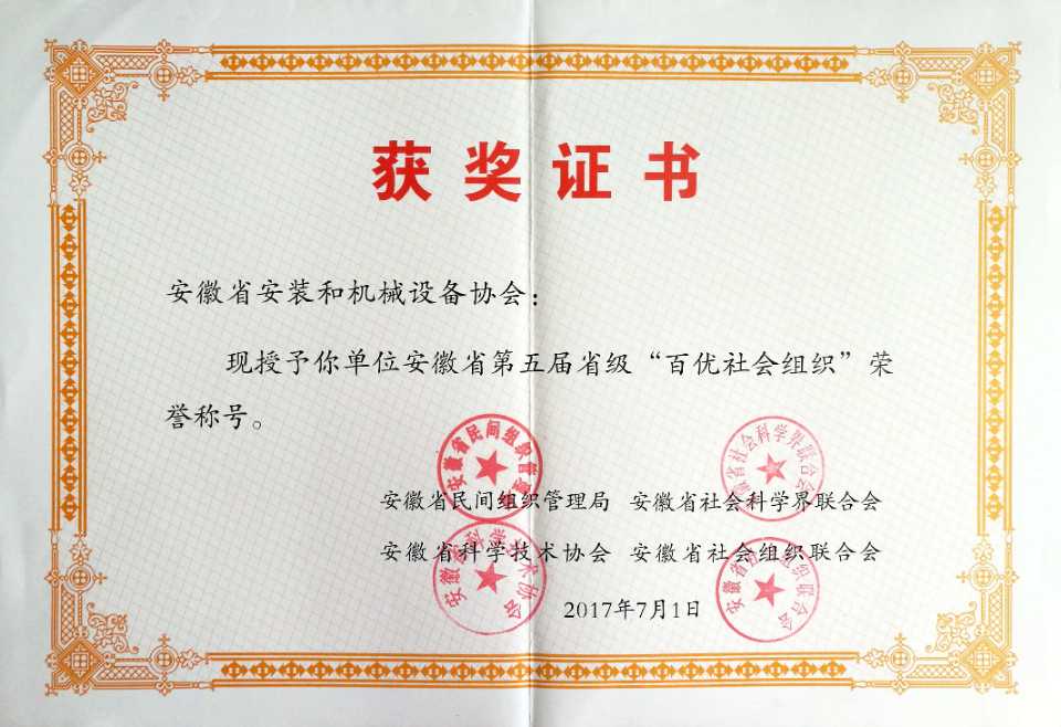 2017年7月,安徽省安裝和機(jī)械設(shè)備協(xié)會第三次榮獲安徽省第五屆省級“百優(yōu)社會組織”稱號,并由安徽省民間組織管理局、安徽省社會科學(xué)界聯(lián)合會、安徽省科學(xué)技術(shù)協(xié)會、安徽省社會組織聯(lián)合會聯(lián)合頒發(fā)了榮譽(yù)證書。