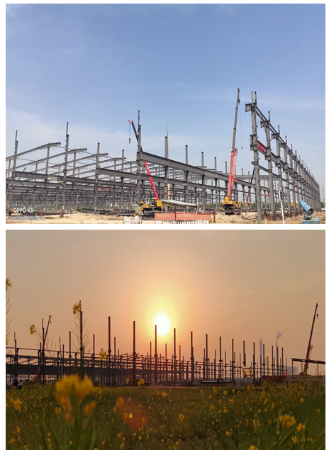 為進(jìn)一步調(diào)動(dòng)參建人員的積極性和創(chuàng)造性,分公司組織開展項(xiàng)目“大干90天”勞動(dòng)競賽,有效形成了一片“比、學(xué)、趕、幫、超”的火熱生產(chǎn)局面。盡管3月底持續(xù)陰雨天氣,但絲毫沒有影響到月施工進(jìn)度,2#車間整體框架已全部按時(shí)間節(jié)點(diǎn)圓滿完成。目前,1#車間安裝正在高速推進(jìn)。
