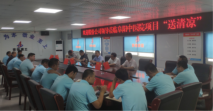 7月16日上午,股份公司副總經(jīng)理黃代、證券事務(wù)部副部長盛道勝赴安徽安裝公司阜陽潁東區(qū)中醫(yī)院建設(shè)PPP項目“送清涼”并調(diào)研指導(dǎo)工作。安徽安裝黨委書記、董事長胡六中,副總經(jīng)理高飛參加調(diào)研。