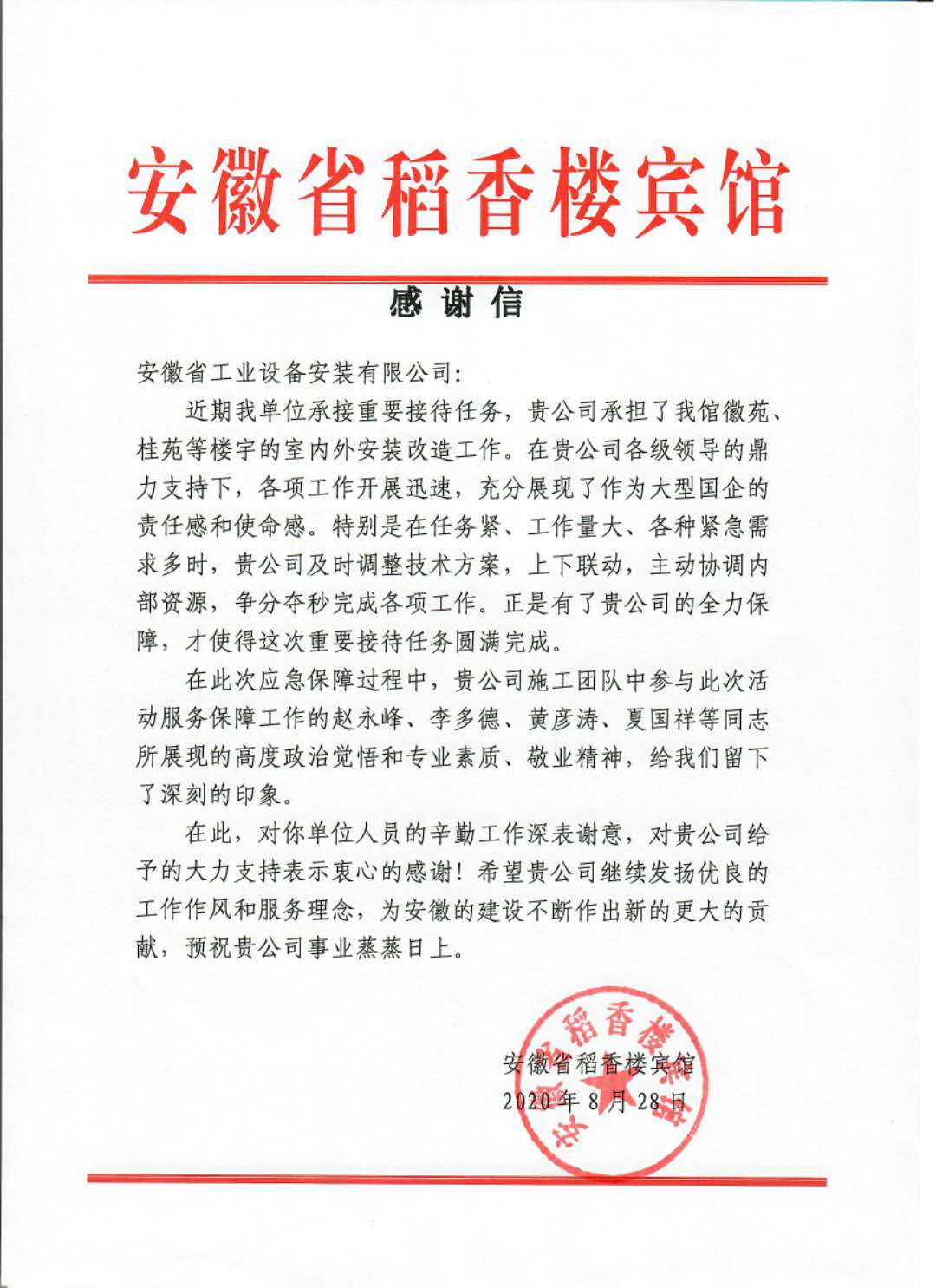 為此,稻香樓賓館發(fā)來的一封感謝信,感謝安徽安裝公司在近期承擔(dān)的稻香樓賓館室內(nèi)外安裝改造工程任務(wù)中,啟動迅速、保障有力、方案得當(dāng)、上下聯(lián)動;通過日夜搶工奮戰(zhàn),爭分奪秒地完成各項工作,充分發(fā)揮國企擔(dān)當(dāng)?shù)闹厝巍?/span>