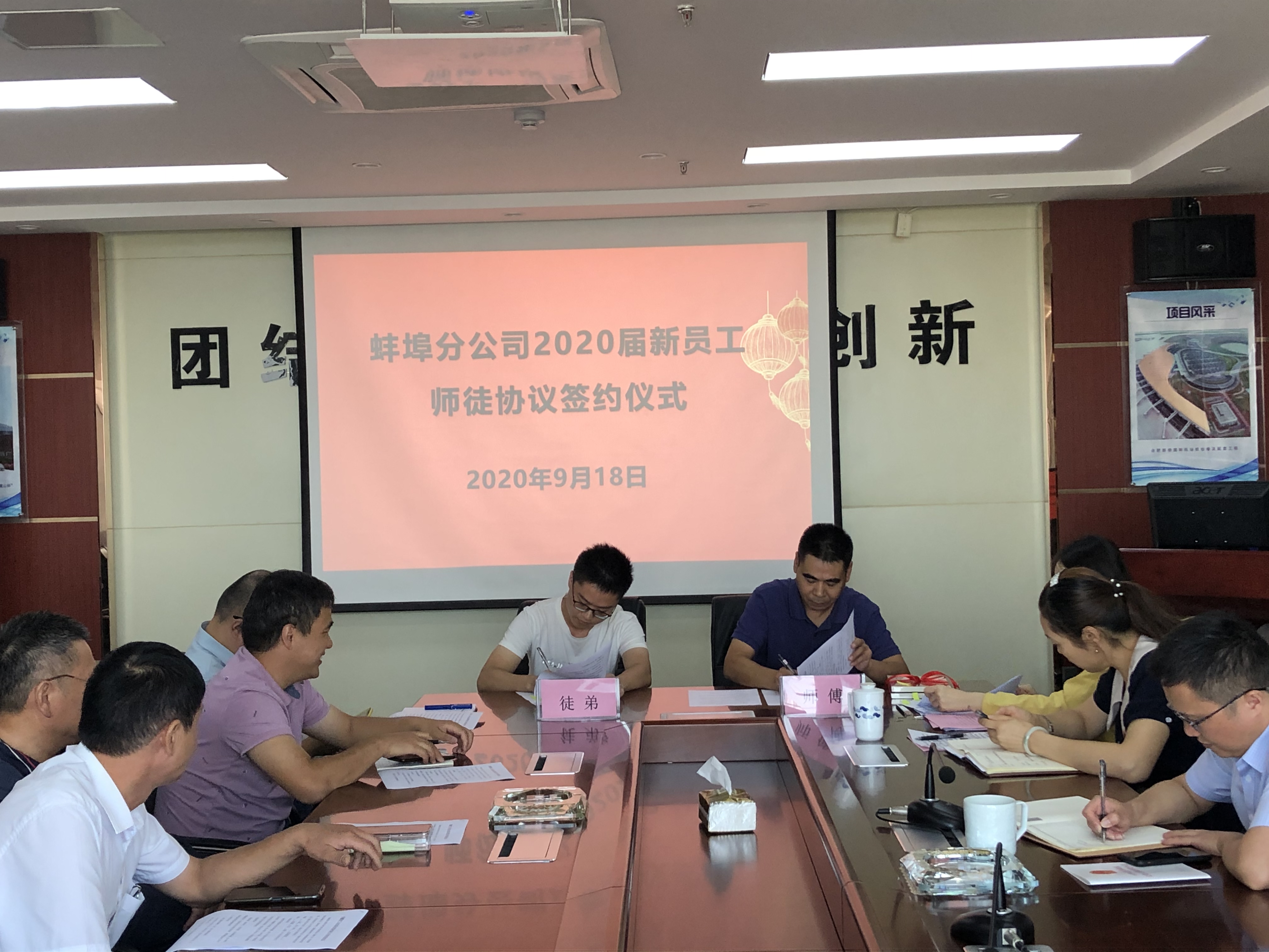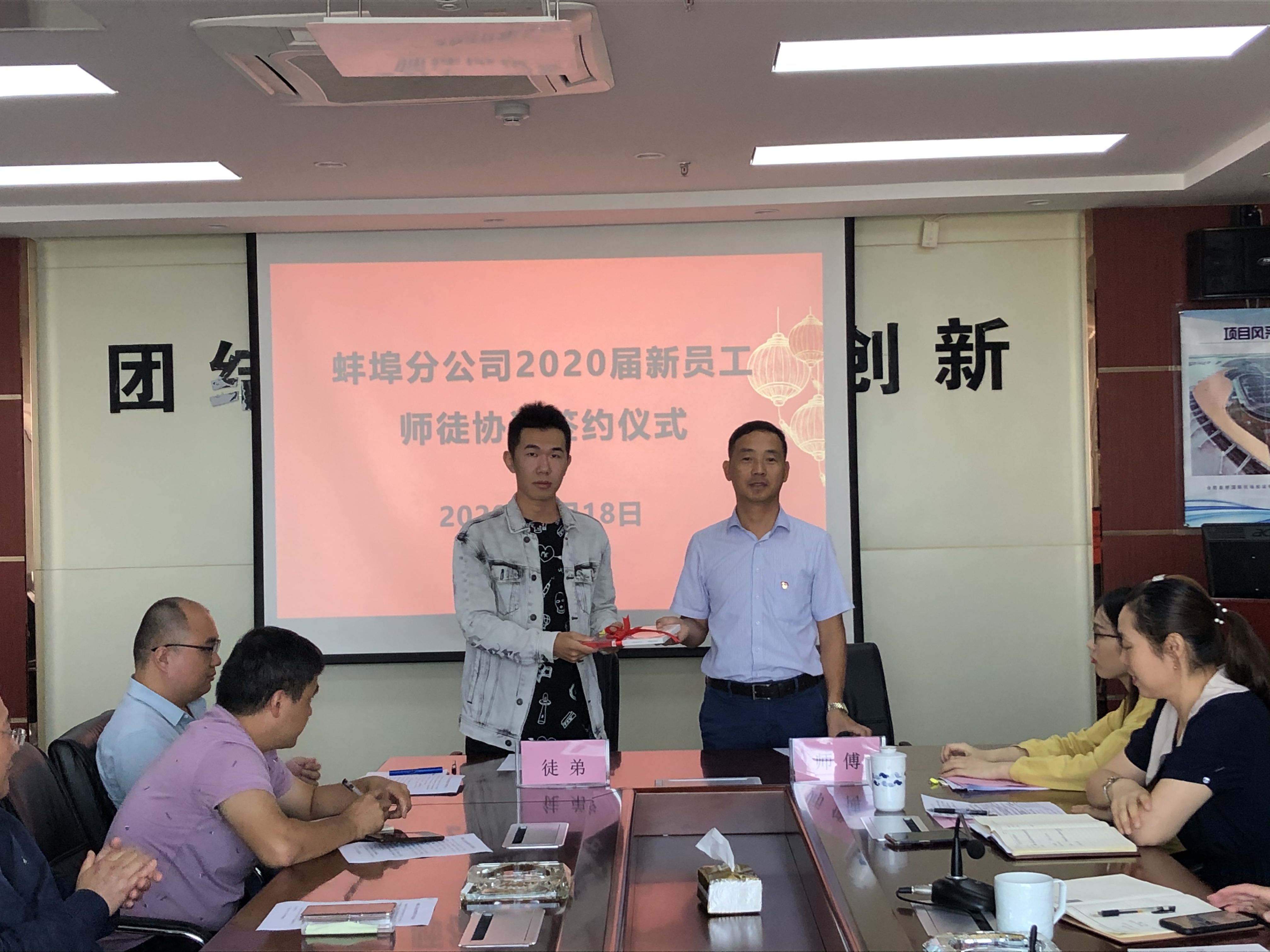 為了幫助新入職大學(xué)生盡快適應(yīng)企業(yè),熟悉工作,勝任崗位,2020年9月18日上午蚌埠分公司黨支部舉行了“2020屆新員工師徒結(jié)對(duì)”簽約儀式。分公司班子成員、部門(mén)負(fù)責(zé)人、項(xiàng)目經(jīng)理、師傅及2020屆新入職大學(xué)生參加了此次會(huì)議。