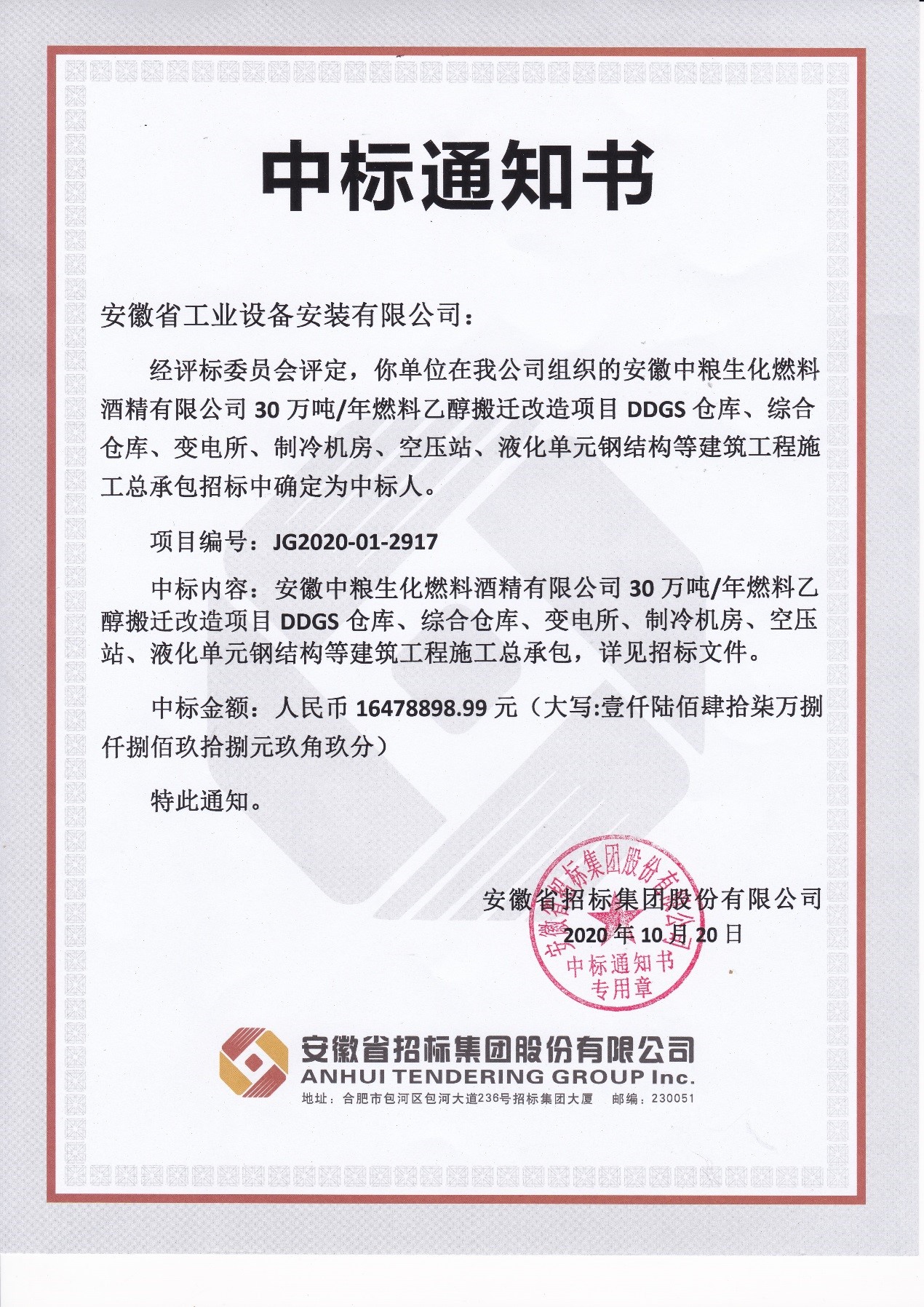 近日,蚌埠分公司經(jīng)過激烈競(jìng)標(biāo),成功中標(biāo)安徽中糧生化燃料酒精有限公司30萬噸/年燃料乙醇搬遷改造項(xiàng)目DDGS倉(cāng)庫(kù)、綜合倉(cāng)庫(kù)、變電所、制冷機(jī)房、空壓站、液化單元鋼結(jié)構(gòu)等建筑工程施工總承包項(xiàng)目,中標(biāo)金額:1647.89萬元。過硬的資質(zhì)、雄厚的技術(shù)實(shí)力、合理的價(jià)格、誠(chéng)實(shí)守信的經(jīng)營(yíng)方式、完善的服務(wù)體系是我們勝出的理由。