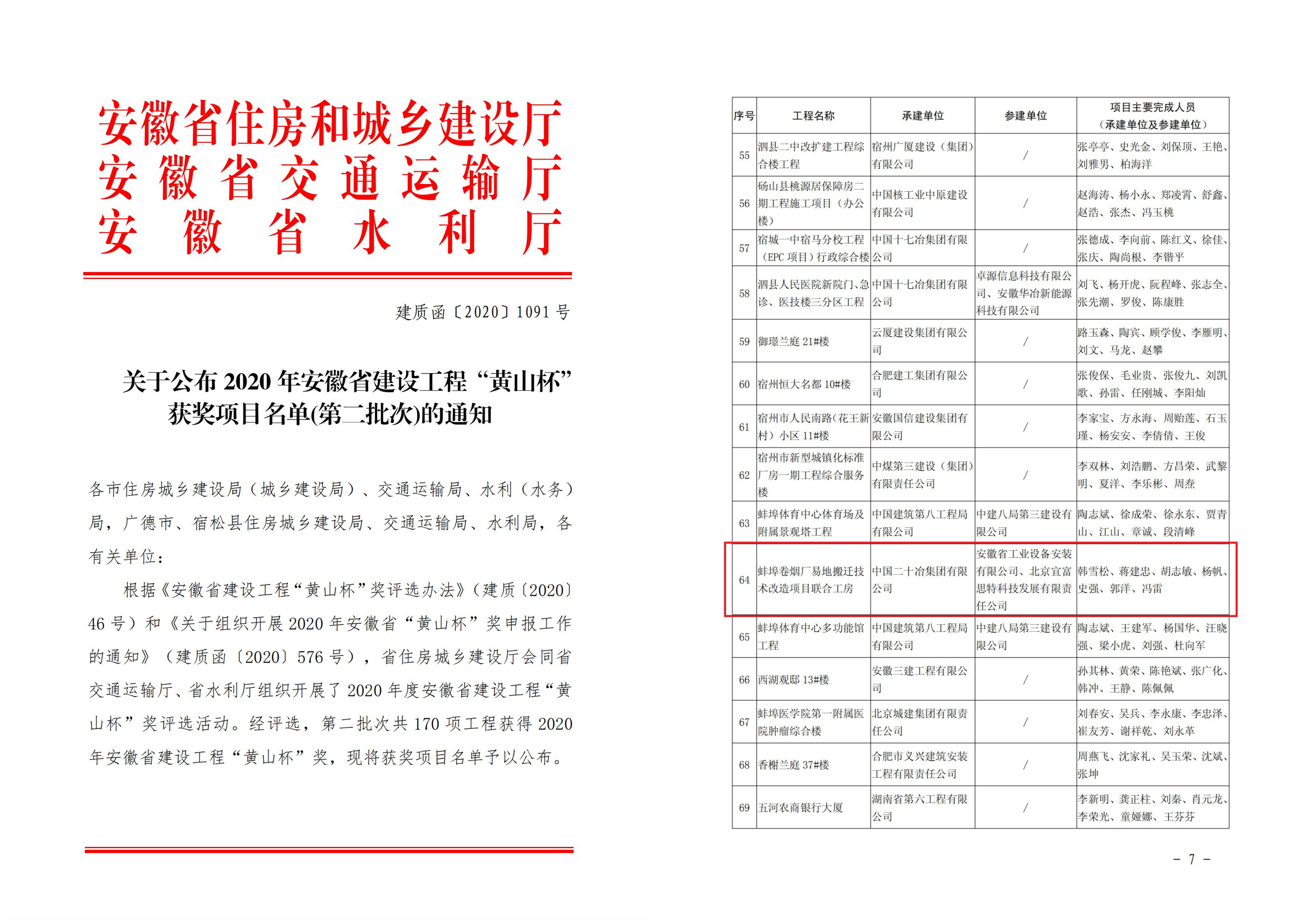 12月14日,經安徽省住房城鄉建設廳會同省交通運輸廳、省水利廳評選,安徽安裝公司蚌埠卷煙廠易地搬遷技術改造項目聯合工房等機電安裝工程榮獲“黃山杯”獎。