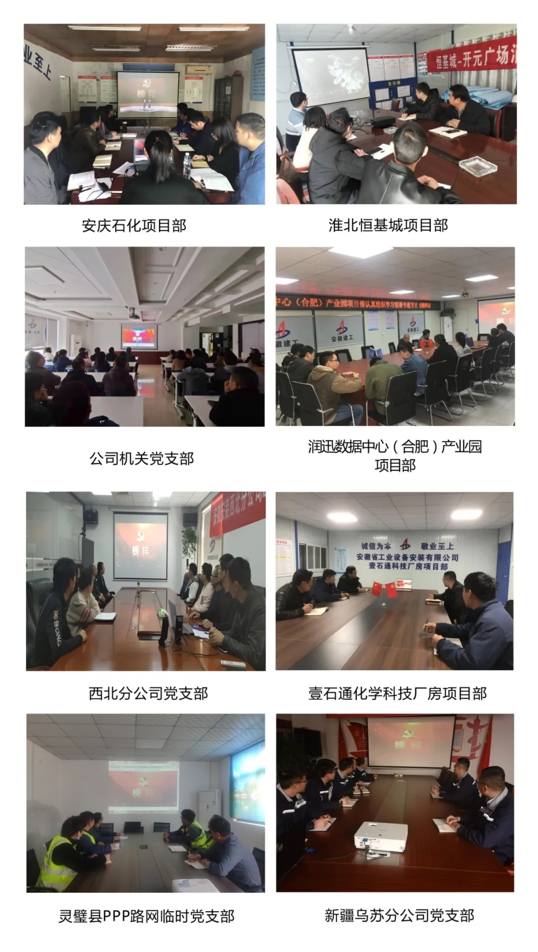 靈璧縣PPP路網(wǎng)臨時(shí)黨支部、壹石通化學(xué)科技廠房項(xiàng)目、潤(rùn)迅數(shù)據(jù)中心(合肥)產(chǎn)業(yè)園項(xiàng)目、蚌埠康寧藥用玻璃管項(xiàng)目、安慶石化項(xiàng)目部于3月22日晚上立即組織共同觀看《榜樣5》,并視頻討論、召開會(huì)議等多種形式進(jìn)行學(xué)習(xí)交流。