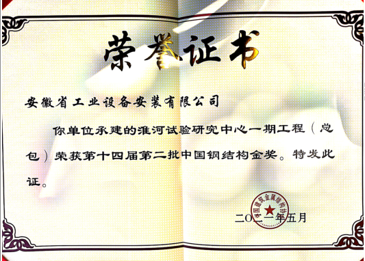 截至目前,該工程已榮獲安徽省鋼結構工程優質工程獎“皖鋼杯”、省級技術成果鑒定1項、省級工法1項、企業級工法1項、1項發明專利已進入實質性審查階段、2019年度省重大合理化建議1項、安徽省安全生產標準化示范工地、蚌埠市安全生產標準化示范工地、集團公司“黨員先鋒號”工程、“工人先鋒號”工程、“青年文明號”工程等獎項,根據公司創優策劃,該工程還將繼續申報“安裝之星”、“黃山杯”等獎項。