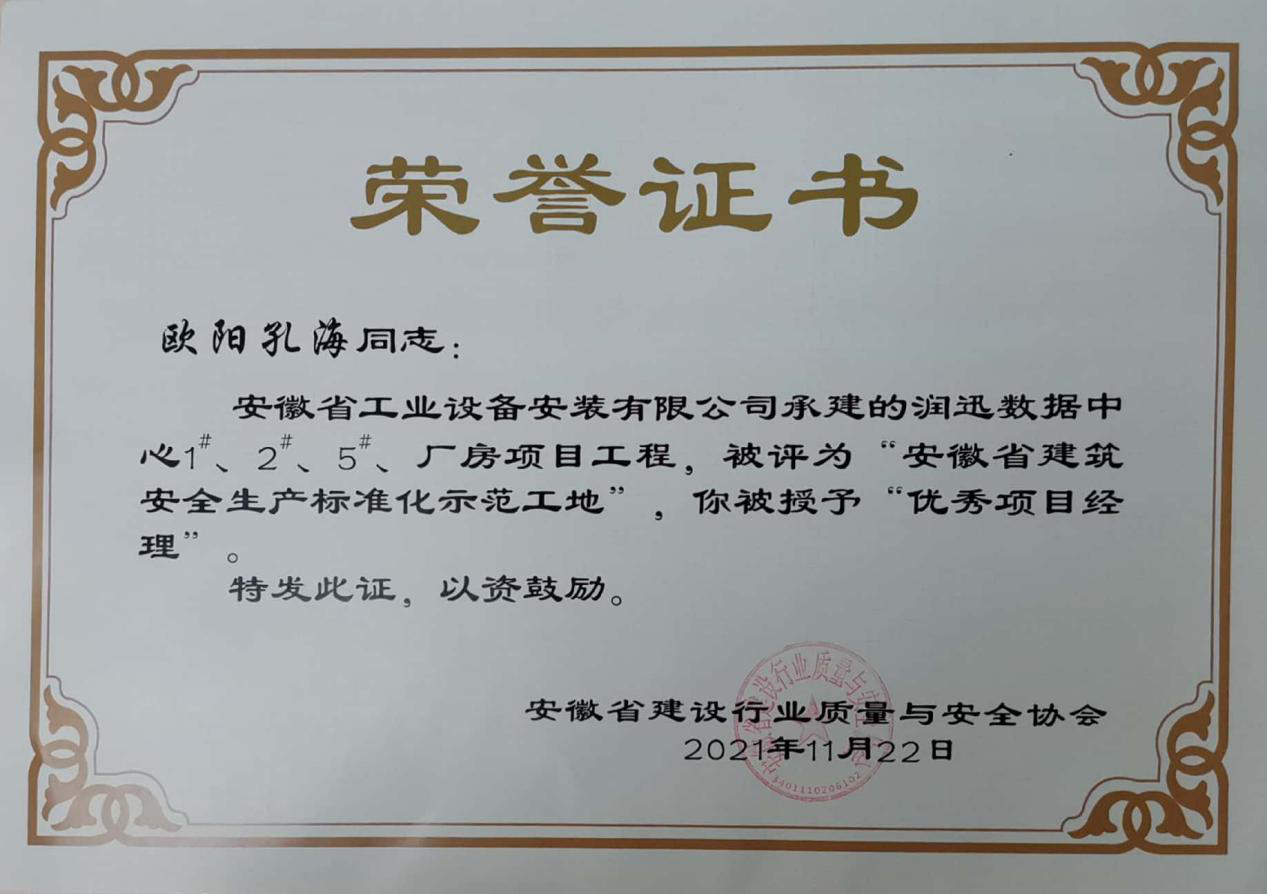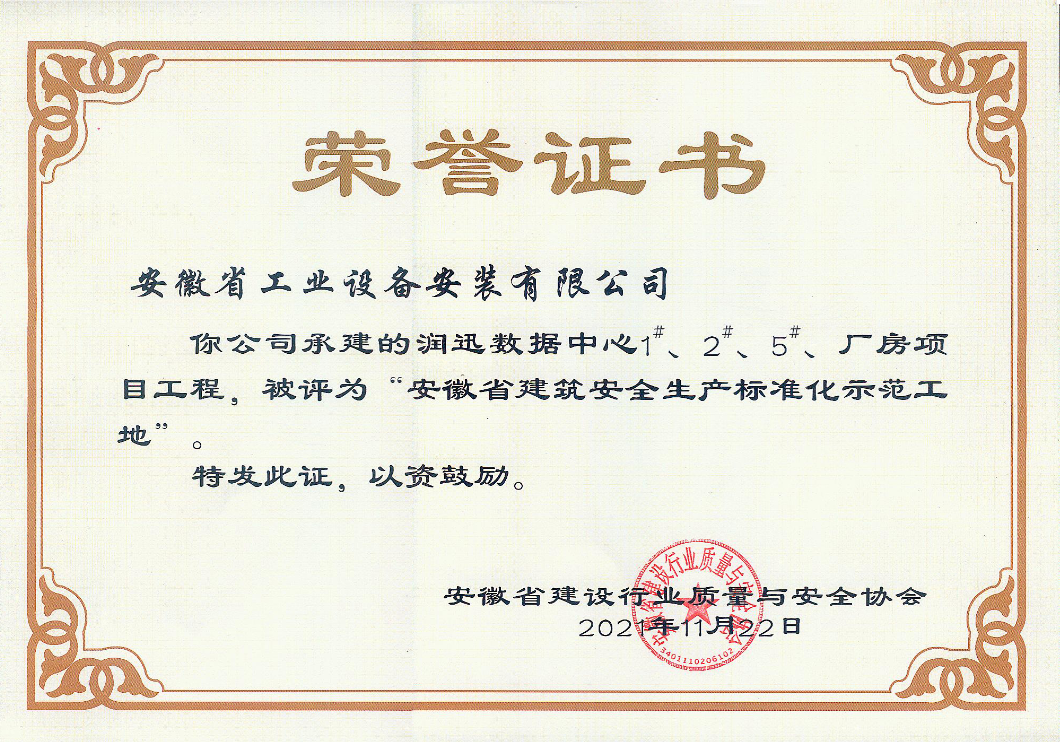 近日,安徽省工業(yè)設(shè)備安裝有限公司承建的潤迅數(shù)據(jù)中心1#、2#、5#廠房項目工程榮獲2021年度“安徽省建筑安全生產(chǎn)標準化示范工地”榮譽稱號。