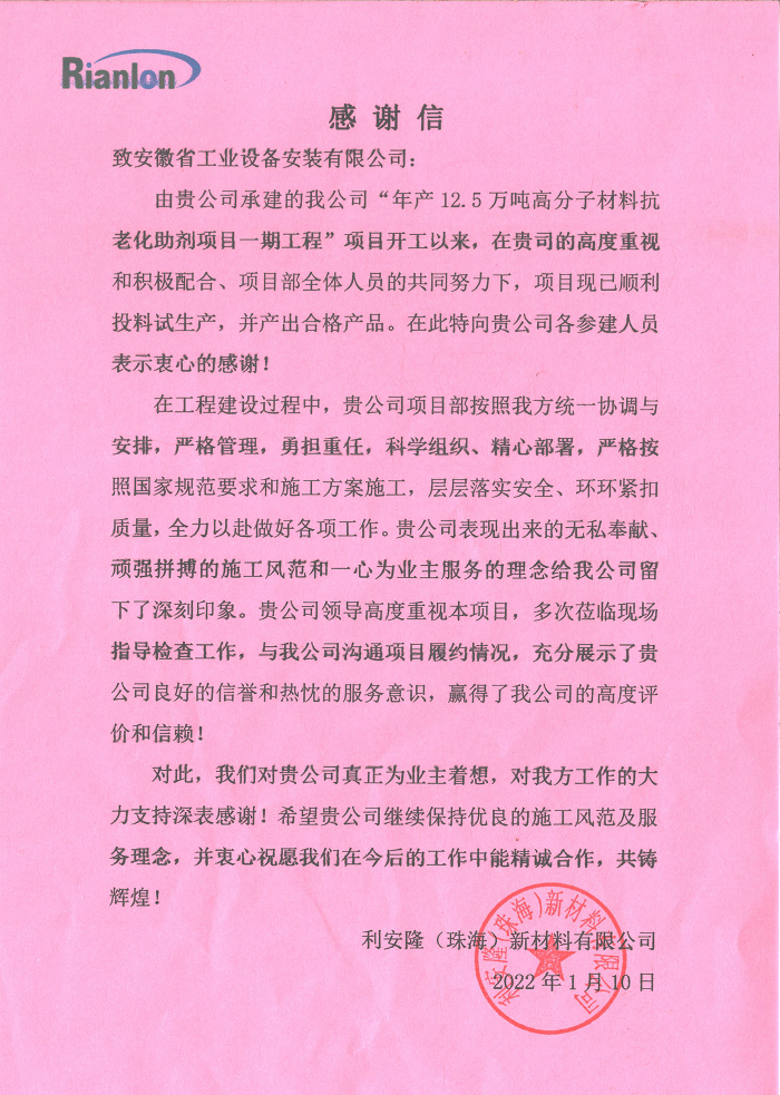 近日,利安隆(珠海)新材料有限公司向安徽安裝公司致感謝信,對(duì)安徽安裝公司“年產(chǎn)12.5萬(wàn)噸高分子材料抗老化助劑項(xiàng)目一期工程”實(shí)現(xiàn)順利投產(chǎn)運(yùn)行產(chǎn)出合格產(chǎn)品表示祝賀,對(duì)項(xiàng)目部全體參建人員付出的艱辛努力與貢獻(xiàn)給予感謝。