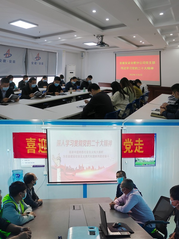 11月2日,安徽安裝合肥分公司黨支部召開黨員大會,專題學習黨的二十大精神。分公司黨支部堅持黨建引領,把學習好、宣貫好黨的二十大精神作為當前和今后一個時期的首要政治任務,通過班子理論學習會、支部“三會一課”、黨員活動日等多種形式,以及微信公眾號、網(wǎng)站、宣傳欄、橫幅標語等多種載體,加大對黨的二十大精神宣貫力度,弘揚偉大建黨精神,用先進的理論武裝頭腦,指導實踐,推動工作,以優(yōu)異的成績推動黨的二十大精神在基層落地生根、開花結果,為推動安徽安裝“十四五”高質(zhì)量發(fā)展而不懈努力。