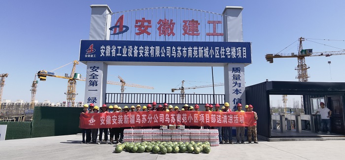 6月的新疆,烈日當頭、酷暑難耐,新疆烏蘇市氣溫一度沖破38℃,給一線施工人員帶來嚴峻的“烤”驗。為了確保烏蘇市南苑新城小區住宅樓建設項目施工進度不滯后,項目部管理人員及一線工人斗烈日、戰酷暑,加班加點、揮汗如雨、搶抓進度。近日,新疆烏蘇分公司南苑新城項目部組織“送清涼”活動,為一線工人送去礦泉水、西瓜、綠豆、冰糖、藿香正氣水、十滴水等防暑降溫物品,并叮囑他們高溫季節施工,一定保護好自己身體。