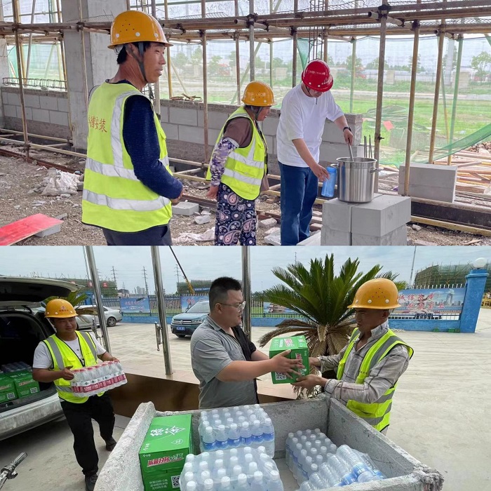 為應(yīng)對高溫天氣安全施工,項目部提前制定防暑降溫工作方案,管理人員在現(xiàn)場設(shè)置納涼棚為工人提供休息場地,針對高溫天氣,采取干兩頭避中間,利用夜晚加班等方式全力推進施工進度。同時項目后勤保障人員在高溫時段提供礦泉水、綠茶等清涼解暑飲品,并持續(xù)每天熬制綠豆湯分發(fā)至各班組,為每位員工帶來絲絲清涼。項目安全科備足人丹、藿香正氣液、十滴水、清涼油、風(fēng)油精等防暑降溫用品,做好高溫天氣施工保障,確保施工安全、高效、有序推進。