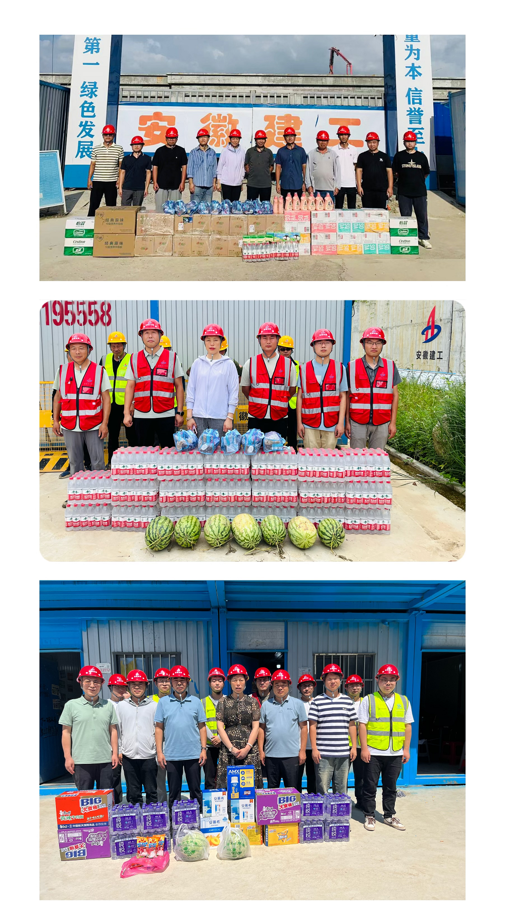 此次慰問(wèn)先后來(lái)到新橋智能制造產(chǎn)業(yè)園、合肥七水廠、阜南第一小學(xué)、阜南污水廠等項(xiàng)目一線,將礦泉水、酸奶、綠豆、毛巾、十滴水、清涼油、風(fēng)油精等防暑降溫物資送到一線職工的手中。慰問(wèn)組一行與職工親切交談,感謝他們烈日下的堅(jiān)守,叮囑他們要注意休息,勞逸結(jié)合,高溫作業(yè)時(shí)要注意安全、做好防暑降溫,保證安全工作與自身健康。