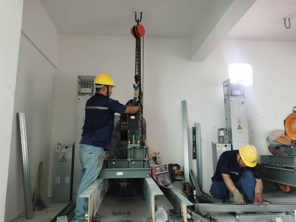蚌埠經開區(qū)消防二中隊項目現(xiàn)場施工人員正在安裝電梯支架
