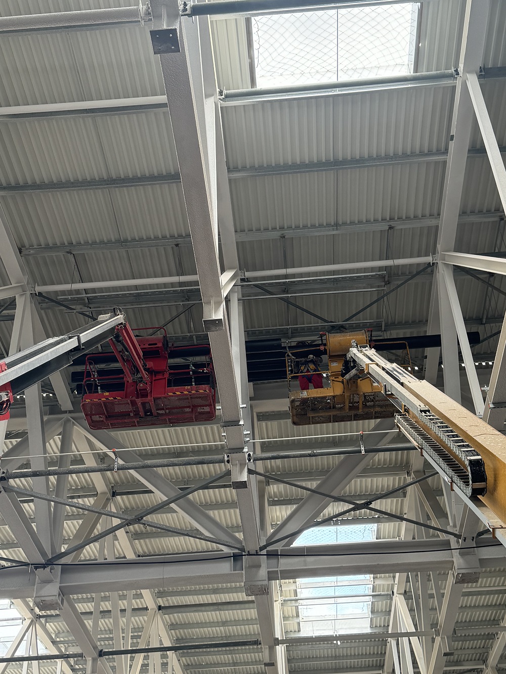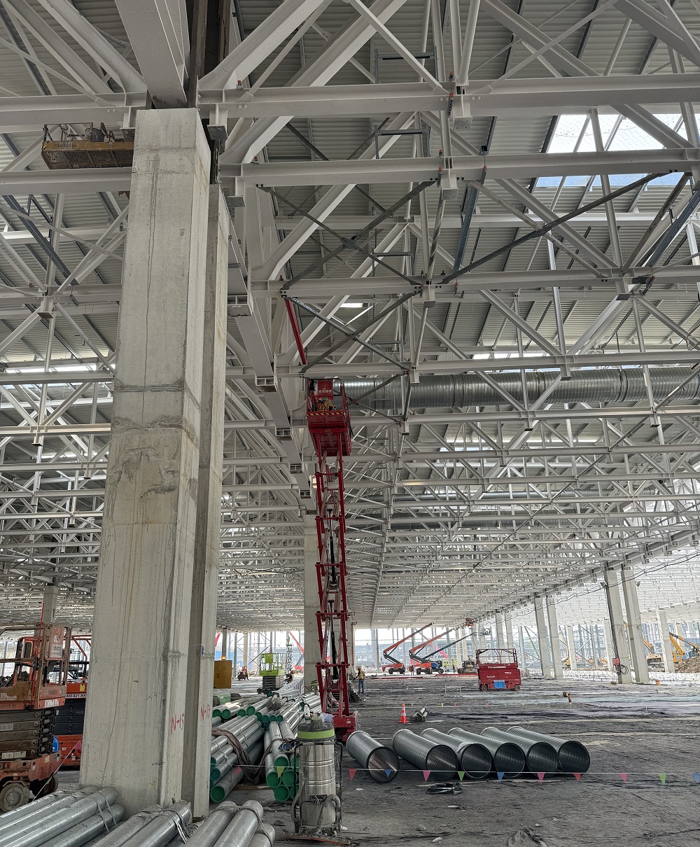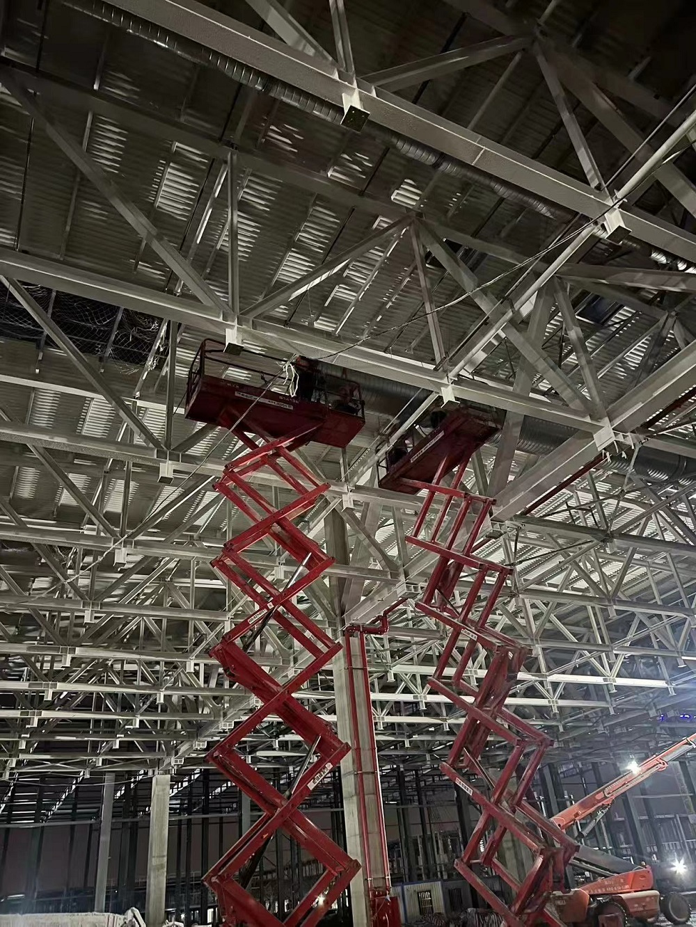 目前正在進行車間一1-6區通風管、照明管、橋架、虹吸雨水管、衛生間排水管、防雷接地、消防管等安裝作業,材料加工區預制各類管道支架也在同步推進?,F已完成車間一風管安裝約3000平方米,風管預制約8000平方米,虹吸雨水管道安裝約120米,照明配管安裝約2000米,消防管道安裝約320米,防雷接地網安裝約10000米,橋架安裝約400米。