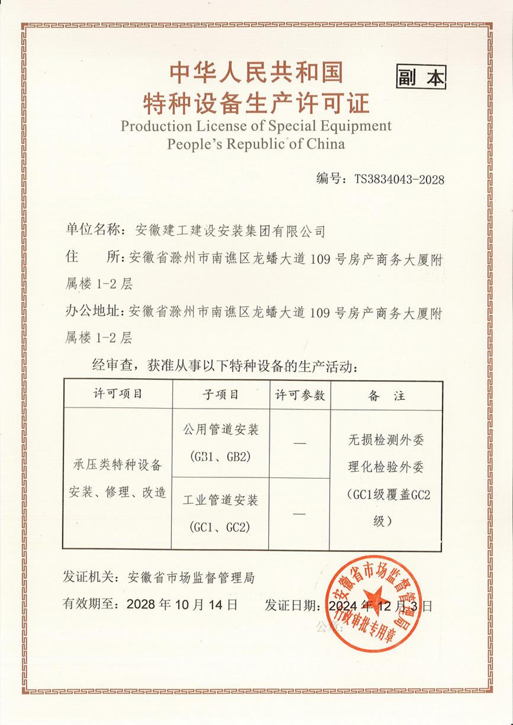 近日,建工安裝“承壓類特種設備安裝、修理、改造—壓力管道(GB1、GB2)、(GC1、GC2)”延續(xù)換證工作順利通過中國工業(yè)氣體工業(yè)協(xié)會、安徽省特種設備檢測院等各方的評審核查,現(xiàn)已取得安徽省市場監(jiān)督管理局頒發(fā)的新證,為公司相關業(yè)務的開展奠定了良好基礎。