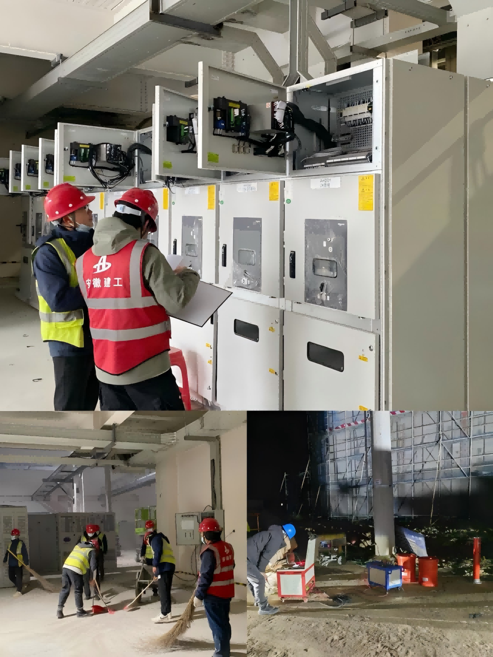 圖為新橋智能制造產(chǎn)業(yè)園機電安裝項目高壓柜二次接線核對、外線電纜耐壓試驗、配電房衛(wèi)生打掃