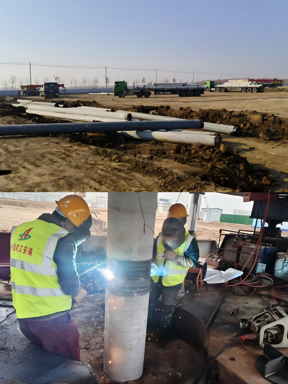 圖為明光涂料、防水材料及配套原料等產(chǎn)品智能化基地一期項目管樁原材料進場、焊接管樁