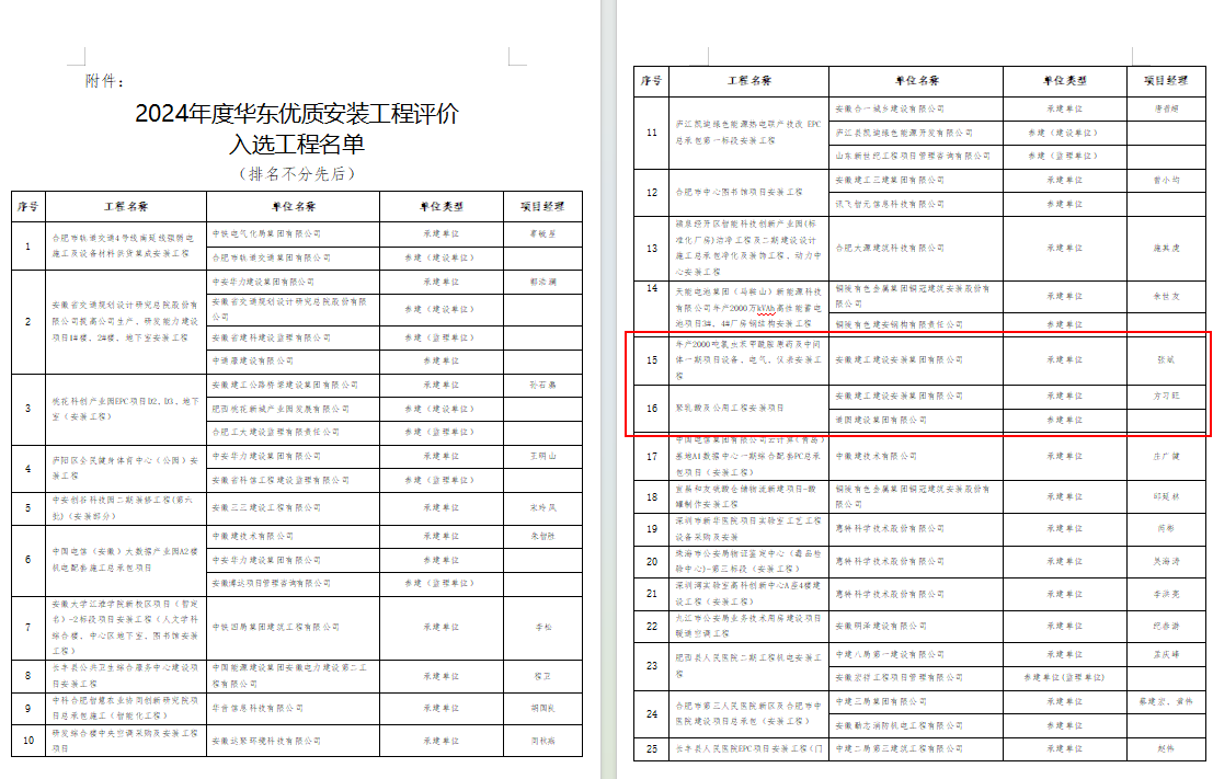 近日,2024年度華東優質安裝工程評價入選工程名單公布。建工安裝蚌埠分公司承建的輝隆年產2000噸氯蟲苯甲酰胺原藥及中間體一期項目設備、電氣、儀表安裝工程成功入選。