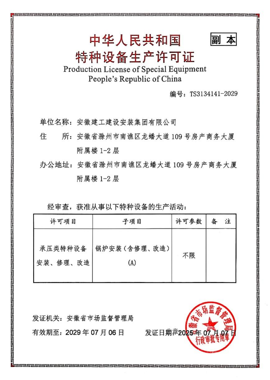 建工安裝順利取得鍋爐特種設備許可A級證書