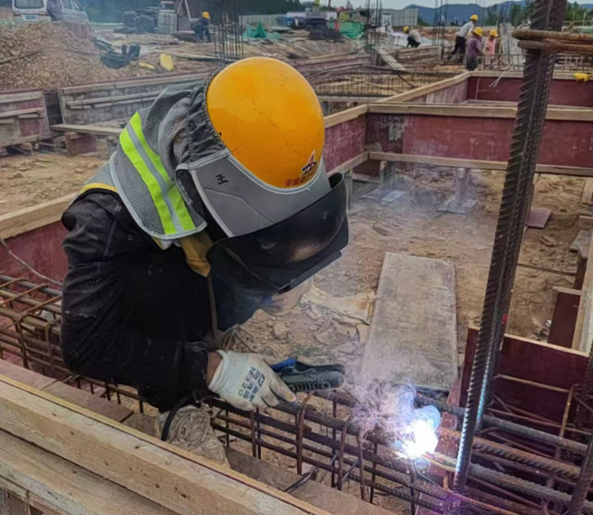 工人穿著汗透的工作服冒著酷暑進行基礎防雷接地焊接
