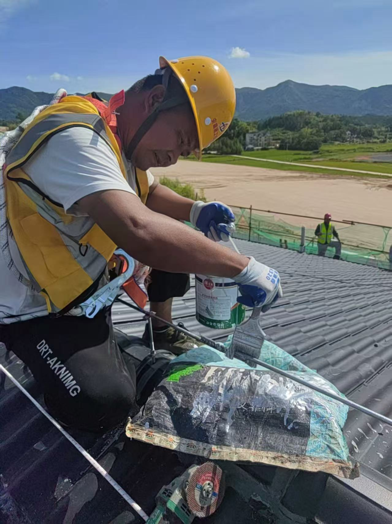 工人頂著烈日的灼燒進行防銹漆的涂刷