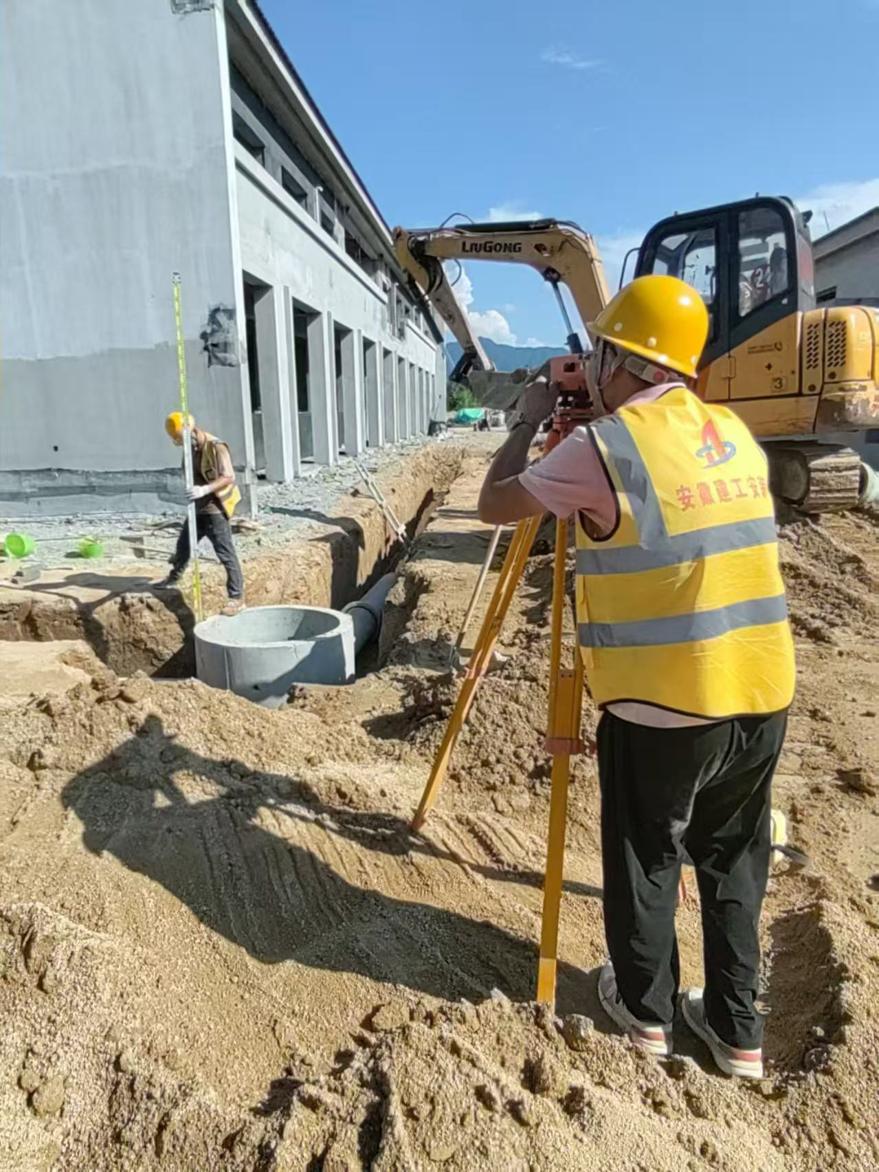 熱浪滾滾中,工人手把水準儀進行井底標高測量