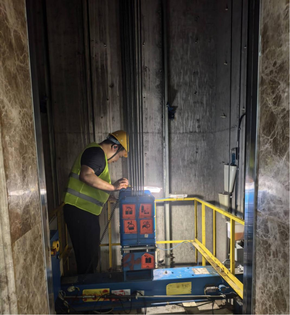 桃花科創(chuàng)產(chǎn)業(yè)園EPC項(xiàng)目施工人員正在調(diào)試電梯主機(jī)平衡度