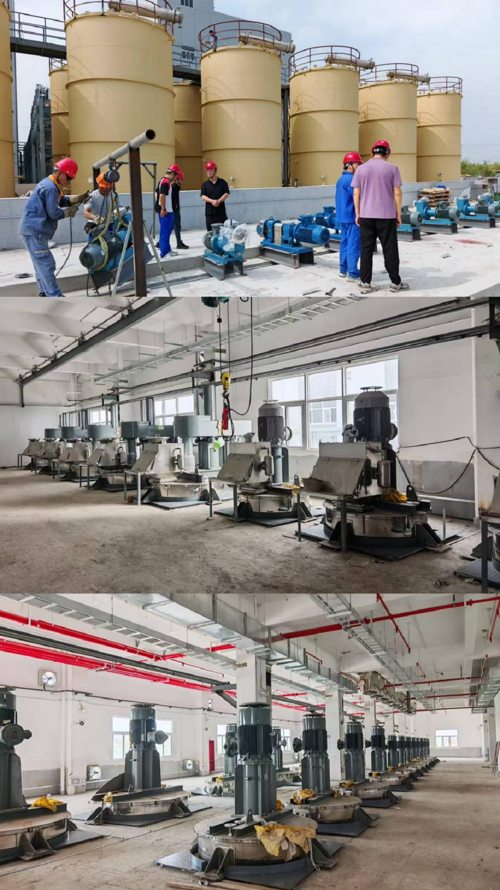 在馬鞍山采石磯項目現場可見大型儲罐等設施矗立,施工人員開展設備安裝等作業,指揮調度清晰有序,各項操作體現專業素養。在車間內部,一排排新設備整齊排列,部分設備已精準安裝就位,施工環境整潔規范,展現精細化管理水平。